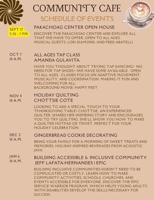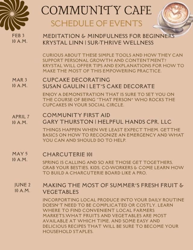 The Community Cafe brings people of all ages together. Featuring engaging topics with Coffees and Teas from Acoustic Java (included). Children are welcome. Crafts, movies and child appropriate drinks will also be offered.